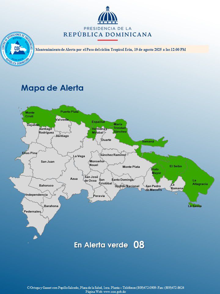 El COE mantiene 08 provincias en alerta verde, debido a que el informe del INDOMET, establece que a pesar que el huracán Erin se encuentra aproximadamente a más de 620 km al norte/noroeste de Puerto Plata, genera una vaguada y su amplia circulación provoca viento del sur/sureste con ráfagas en ocasiones.
